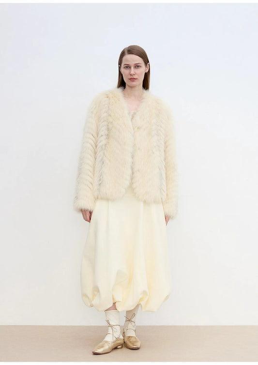 "Champagne on a Snowy Night" Imported Fox Fur Two-Tone V-Neck Oblique Stripe Slim Jacket